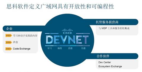 除了提供卓越的安全和應(yīng)用體驗外,思科SD-WAN還具備開放性與可編程性。曹圖強表示,“首先,思科將通過 DevNet 開發(fā)平臺向所有用戶開放API,為開發(fā)人員提供更大價值;其次,對合作伙伴而言,思科希望提供一個可交互的平臺幫助用戶進行分享。任何用戶有特殊的需求,可以在DevNet 與大家分享。具體來說,在整個安全的廣域網(wǎng)部署中, IT人員可以通過開放的平臺,根據(jù)不同的環(huán)境和需求進行二次開發(fā)。”